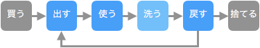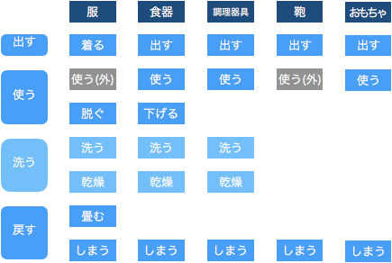 基本的にはこのようにモノを「出す」、「使う」、(洗う)、「戻す」の流れを意識して、モノの定位置を決めていきます。