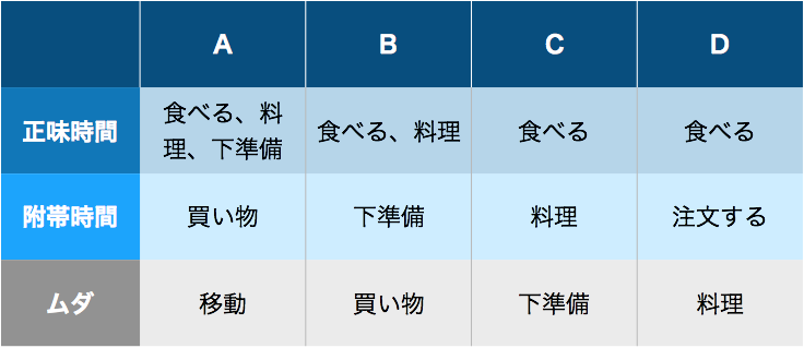 食事や料理を例にすると、とある家庭(D)では「とにかく栄養を摂る事」としていれば、外食でも惣菜を買うのにも拘りません。しかし、別の家庭(A)では「自分達で健康で安全な食事を作り、食育を重視する」と言う価値観の場合は、料理をしたり、教える事も教育の時間となり、ムダでは無く、正味時間となります。