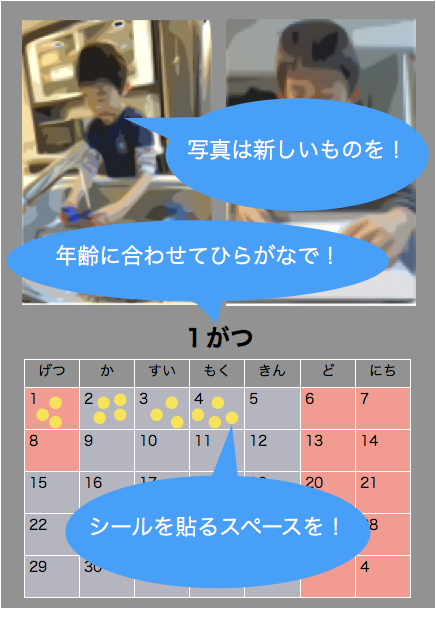 小学生になると漢字も読める様になりますが、6歳までは厳しいでしょう。できるだけ曜日や月はひらがなで書きましょう。