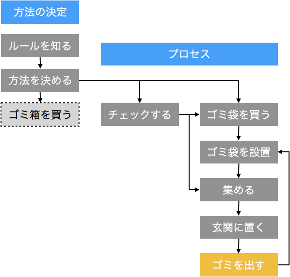 この様に、「ゴミ出し」でも、一番最後の「ゴミを出す」までに様々なプロセスがある事が分かります。