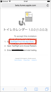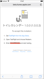 このメールで「View in TestFlight」をクリックすると、ウェブブラウザが立ち上がり、下記のような画面に遷移します。
