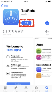 このアプリが「Apple」社のものである事を確認し、「入手」ボタンをタップし、TestFlightアプリをインストールします。