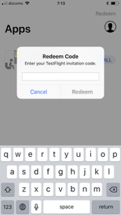 - TestFlightアプリを起動し、「Redeem」を選びましょう。