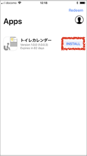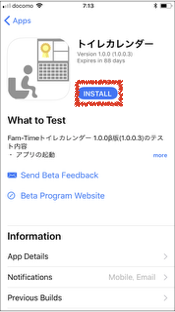 TestFlightアプリ上にテストしてほしいβ版アプリの「トイレカレンダー」が表示されるようになりますので、「INSTALL」をタップすると、インストールが開始されます。
