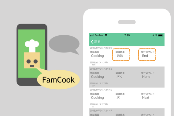 なお、音声認識結果ログは、FamCookの「アカウント・設定」タブから、「音声認識結果ログ」を選択する事で過去72時間の音声認識結果を参照する事が出来ます。