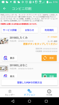 「更新」ボタンをタップする事で、状況が更新されます。右上に「データ作成中」と書かれている状態では、コンビニで印刷することは出来ません。しばらくして、「更新」ボタンをタップしてください。(目安としては40秒程で作成されます。)